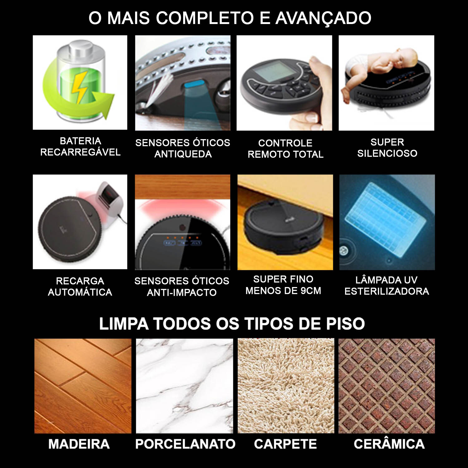 O aparelho conta com escova lateral para limpeza dos cantos e com sensores que identificam os obstáculos para proteção dos móveis.