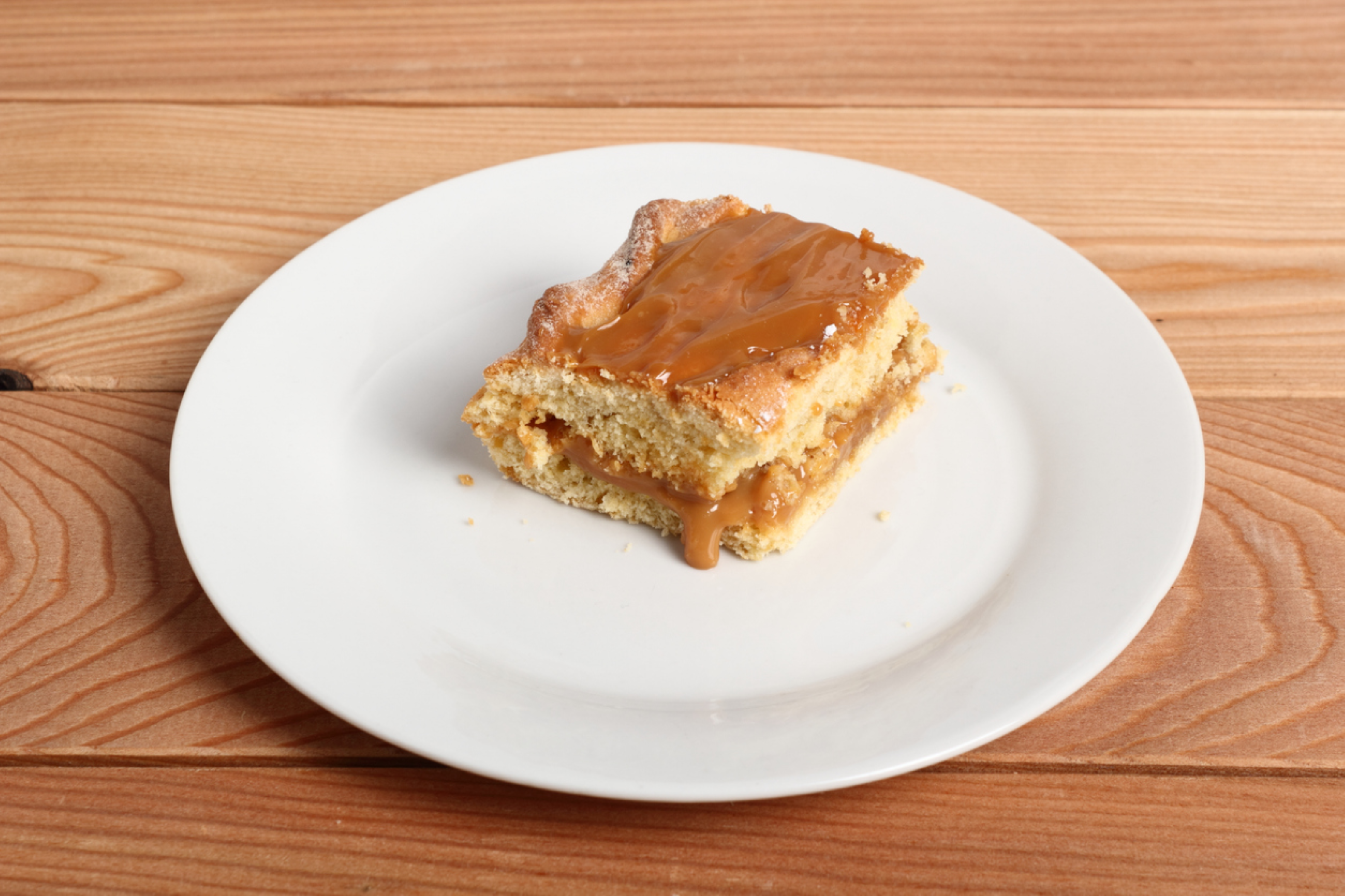 - 3. Pincele a calda de doce de leite sobre uma das partes do bolo e espalhe metade do recheio.