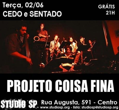 Em mais uma edição do projeto Cedo e Sentado, no Studio SP, o Projeto Coisa Fina se apresenta com entrada Catraca Livre. O show começa às 21h, nesta terça-feira, dia 2 de junho.