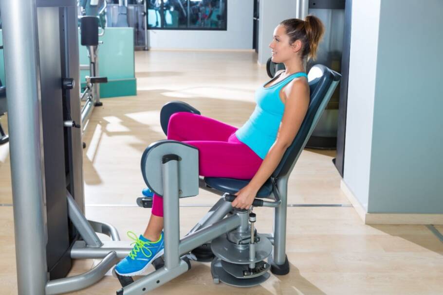 A cadeira abdutora foca a ativação das laterais dos glúteos. Para usá-la, sente-se na máquina com as pernas nos suportes, abra-as empurrando para fora e retorne controladamente até seu fechamento.