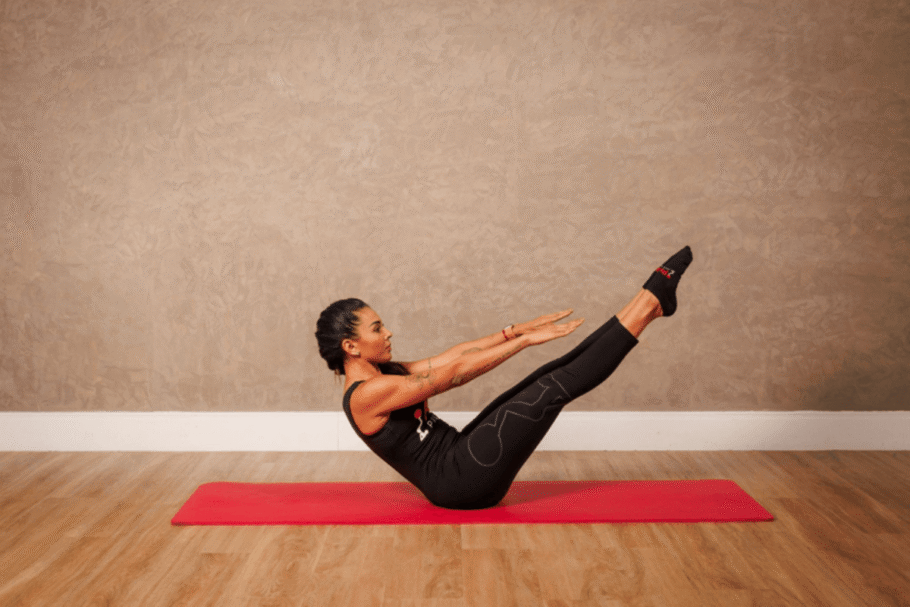 Realize o movimento mantendo a cabeça sem encostar no mate e mantendo as pernas elevadas e unidas. Eleve os braços apontando para os pés. Comece a fazer um rolamento para cima e para frente, levando as mãos apontando para os pés até que seu corpo fique em posição de “V” (equilibrando sobre os glúteos). Role novamente para trás e para baixo, mantendo as pernas elevadas, e suba novamente o tronco. Repita 3 vezes e deite-se lentamente e com controle até encostar a cabeça e as pernas no mate.