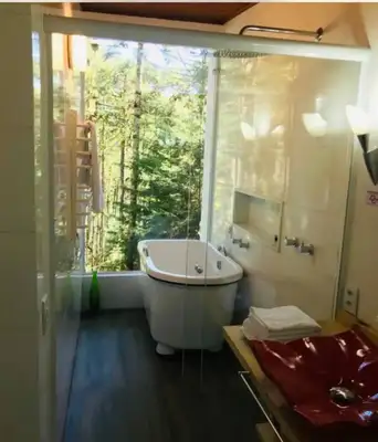 A cabana conta com cama queen size, banheira de imersão, aquecedor de toalhas entre outras comodidades.