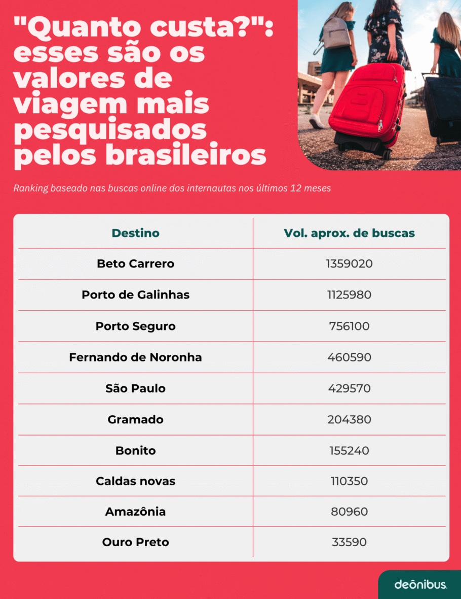 Isso é corroborado por um estudo da plataforma DeÔnibus, que apontou que as expressões mais comuns, vão de termos como “valor da viagem para” a “quanto custa ir para”, revelando o desejo da população por opções promocionais, pacotes acessíveis e rotas que caibam no bolso.