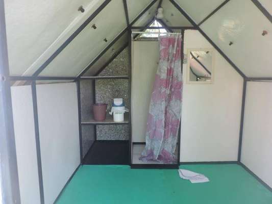 Os quartos tem cerca de 2,15 x 2,15m e contam com armário, vaso sanitário e chuveiro. O chão é todo revestido de EVA prontinho para que você monte seu colchão inflável ou saco de dormir. Experiência muito bacana, ideal para quem quer acampar, mas não abre mão da privacidade de um banheiro particular.