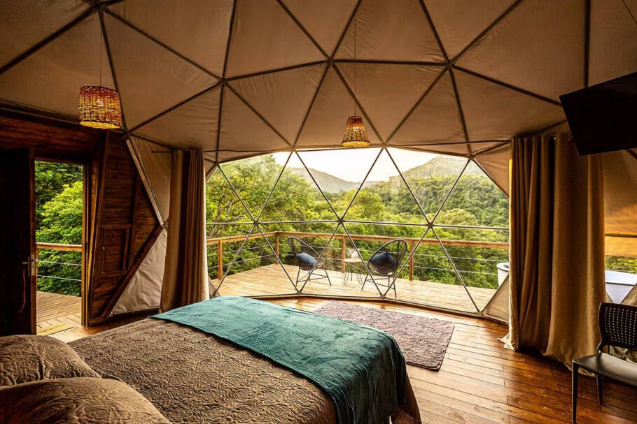 Destino ideal para quem busca por privacidade e conexão com a natureza (vizinhos são tucanos, macacos e outros animais silvestres), somada a uma experiência de tecnologia, design, privacidade e conforto. A hospedagem, com diversas funcionalidades controladas por comando de voz, possui cerca de 40m² e deck privativo de 50m² de área útil a uma altura de –7 metros do chão, com uma banheira de imersão quentinha à sua disposição!