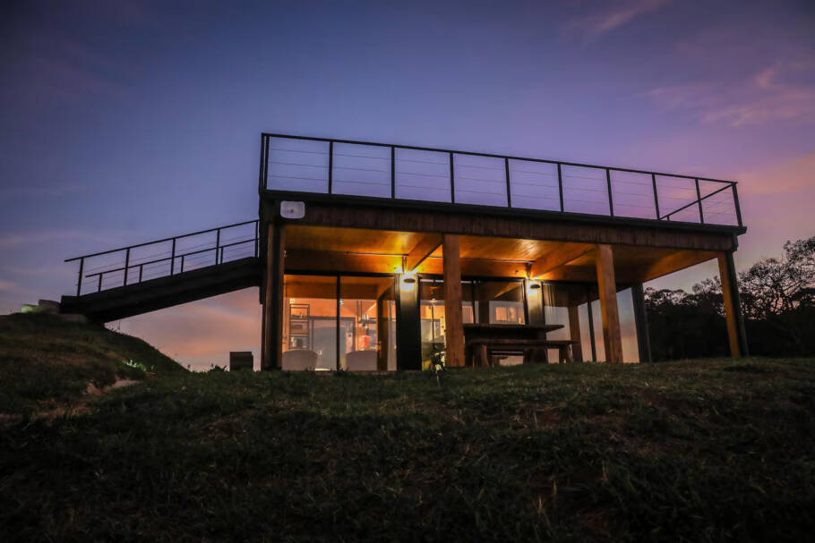 A casa possui uma suíte no andar superior com banheira de hidro, vista panorâmica para as montanhas e o nascer do sol. Sala e cozinha integrados no primeiro andar com banheiro, sofá cama e deck externo coberto.