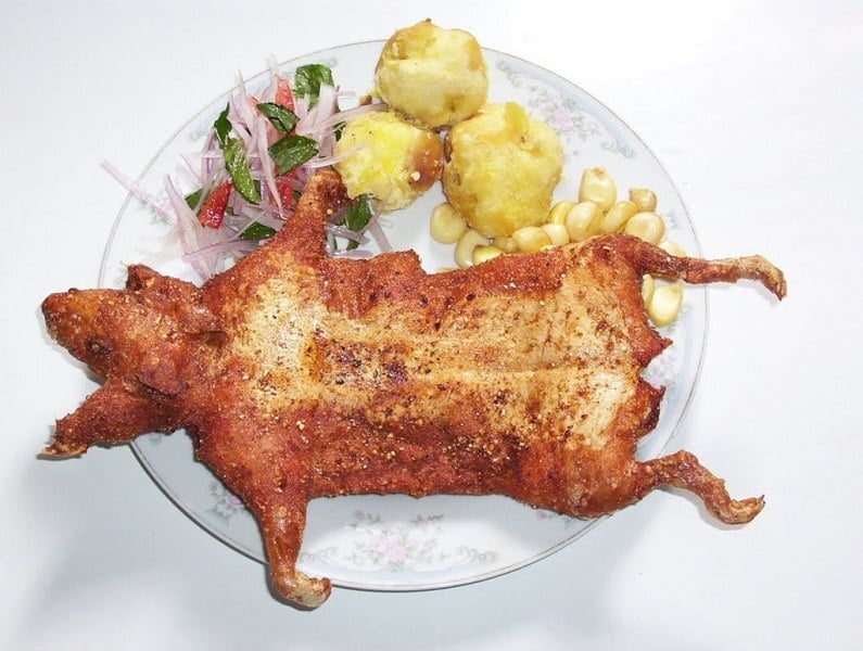 Na verdade o cuy é o nosso conhecido porquinho-da-índia. As populações andinas consumiam o cuy muito antes da chegada dos espanhóis. Ele pode ser feito de muitas formas, as mais comuns são ao forno ou chactado(frito). Em ambas as formas, o cuy é servido inteiro, com cabeça e patas, só órgãos internos são retirados. Em alguns restaurantes, os cuys são mantidos vivos até o momento de cozinha-los e você pode escolher qual deles você vai querer comer. O sabor é similar ao do frango e é muito saudável, a desvantagem é que o cuy, por ser muito magrinho, não tem muita carne.