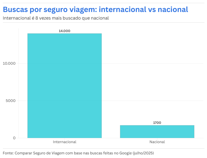 Além disso, a mesma pesquisa, redigida por Comparar Seguro de Viagem, aponta que, no Brasil, as pesquisas pelo termo “seguro viagem internacional” são oito vezes maiores que as pesquisas pelo termo “seguro viagem nacional”. Enquanto o anterior performa com aproximadamente 14 mil buscas mensais, o último contabiliza apenas 1.7 mil.