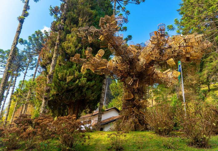 O Parque Bambuí abriga obras assinadas por grandes nomes da arte contemporânea brasileira. As esculturas monumentais estão espalhadas pelo gramado e se fundem à vegetação, como se tivessem brotado junto com ela. É o caso de “Voo dos Pássaros”, de Eduardo Srur, feita com mais de 1.000 gaiolas reais apreendidas pela Polícia Federal, e o impressionante “Elefante Bambuí”, do renomado artista plástico Rafael Brancatelli, que parece observar o entorno em silêncio.