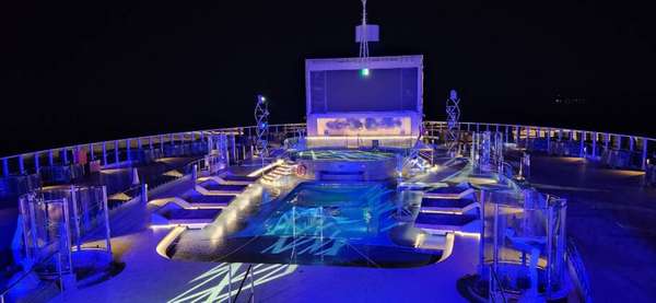 Com suas seis piscinas, o navio oferece um equilíbrio entre ambientes adequados para crianças e adultos. Destaque para a Marina Pool e a Jungle Room Pool (com teto retrátil), localizadas em lados opostos do deck 18.