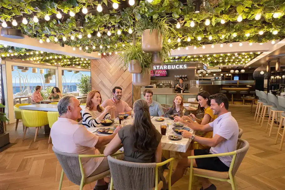 Essa área ao ar livre conecta os hóspedes a alguns dos principais restaurantes a bordo, reunidos no Indulge Food Hall, que oferece 11 opções gastronômicas. Entre elas, estão o Q Texas Smokehouse, especializado em culinária do sul dos EUA, e um Starbucks.