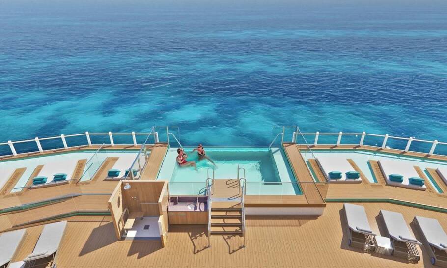 Na parte molhada, a Infinity Beach oferece duas piscinas infinitas, localizadas em cada lado do navio, ideais para relaxar com vistas impressionantes do oceano.