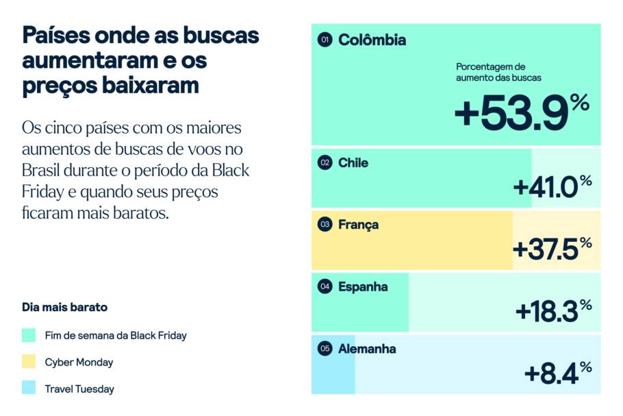 Em 2024, a Colômbia liderou o ranking com aumento de 53,9% nas buscas e tarifas até 10% mais baixas na semana da Black Friday. O Chile teve alta de 41% na procura e queda média de 7% nos preços. França, Espanha e Alemanha completam o top 5, com destaque para a Cyber Monday, quando as tarifas chegaram a cair até 9%.