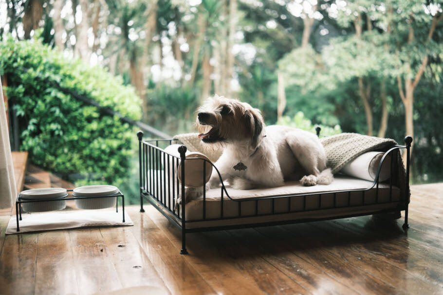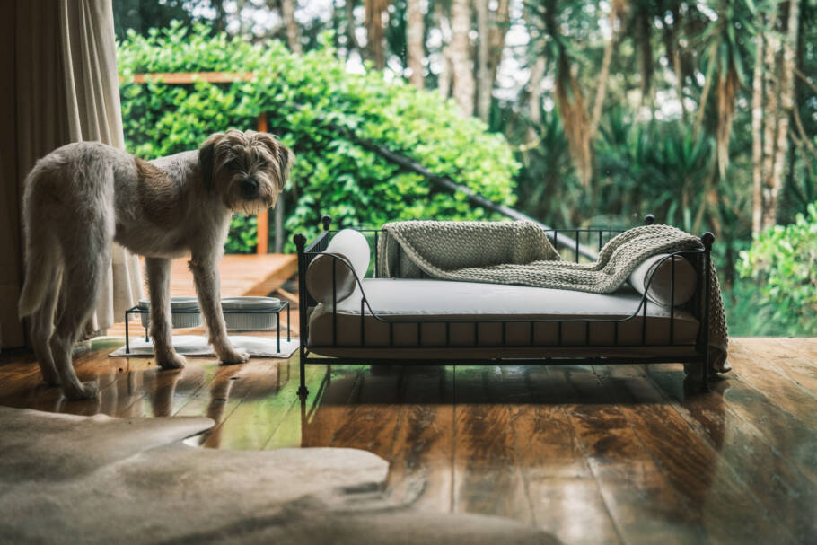 Os filhos de filhos de quatro patas têm acomodações pensadas especialmente para eles: camas exclusivas, mantas macias, comedouros elegantes e liberdade para explorar trilhas na companhia dos tutores.