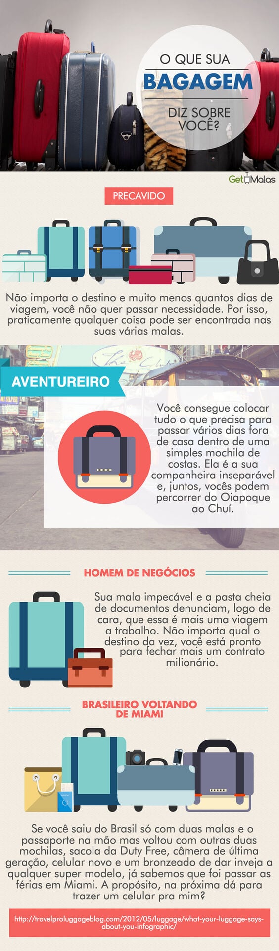 Quem nunca descobriu um brasileiro no aeroporto de Miami só olhando as suas malas? E o homem de negócios? E quem é essa pessoa que consegue viajar só com uma mochila nas costas??? O infográfico abaixo revela o que a sua mala diz sobre você.
