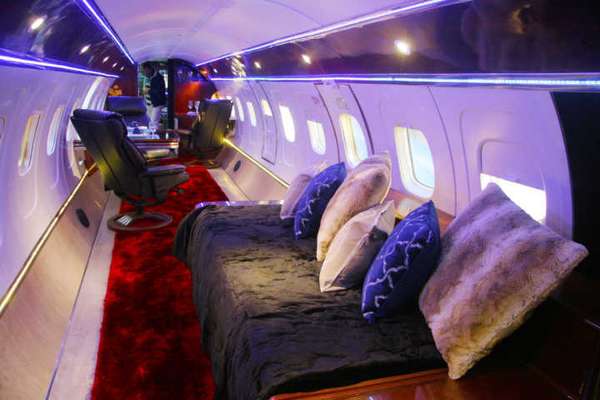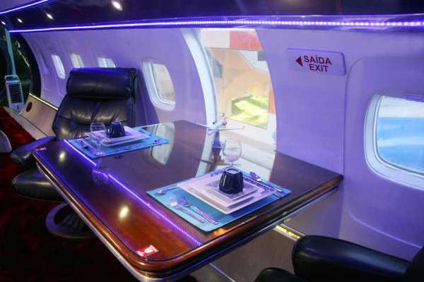 O interior é decorado com luzes de LED, mesa de sala de bordo, poltronas giratórias, mesa retrátil feita com partes do avião, sofá-sala, banheiro com hidromassagem, guarda-malas, TV 4K de 49′, climatizador [quente e frio], mini-bar, lareira elétrica, entre outros mimos.