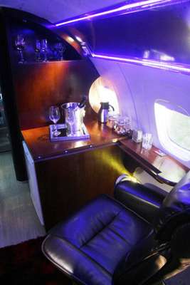 Uma escada em caracol liga a aeronave a uma pequena “torre de comando” decorada com poltronas com motivos aeronáuticos e que oferece uma vista panorâmica.