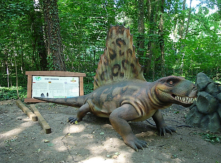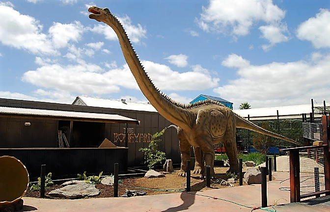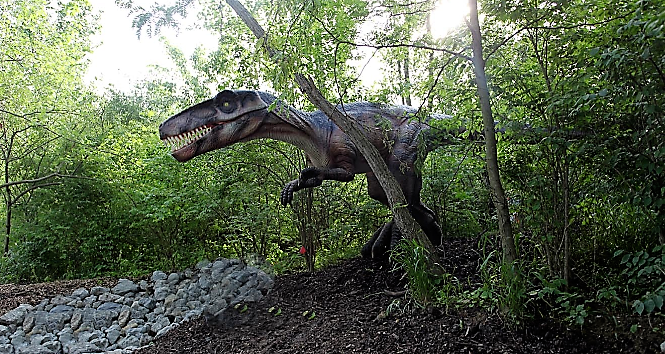 São 30 dinossauros, entre eles o T-Rex, que mexem cabeças, caudas, olhos, mandíbulas e emite sons assustadores.