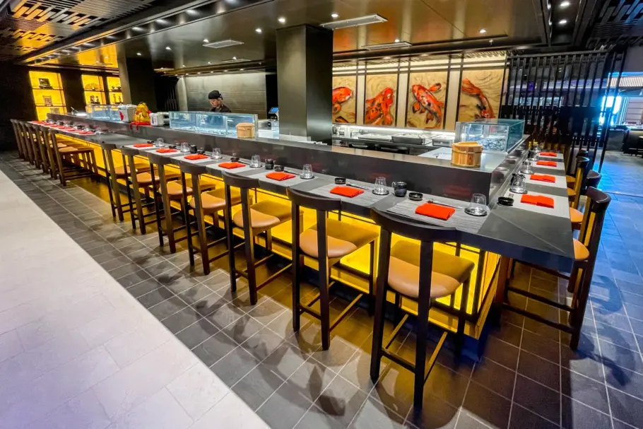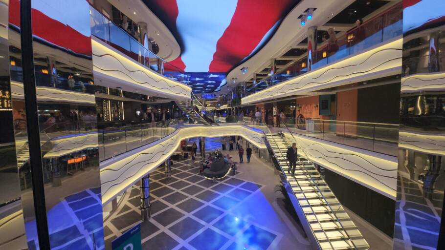 Para os amantes da gastronomia e da vida noturna, o World Galleria é o ponto de encontro. Com uma cúpula de LED que cobre a principal promenade do navio, esse distrito vai abriga lojas de grife, cafeterias, bares temáticos e restaurantes de especialidades, como o Kaito Teppanyaki & Sushi Bar, que combina performance e alta culinária oriental. À noite, o espaço se transforma com shows e eventos interativos.