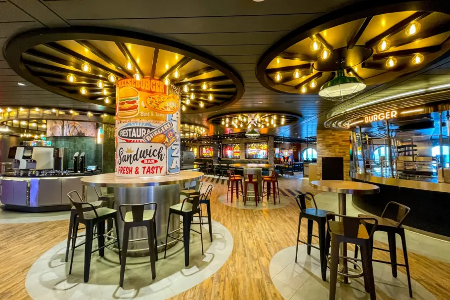 Ao entrar no navio já é possível notar sua vocação para o mercado norte-americano. Pela primeira vez, a MSC Cruzeiros dedicou um espaço exclusivos para pizzas e sanduíches, o Pizza & Burger, localizado na World Gallery, no deck 6.