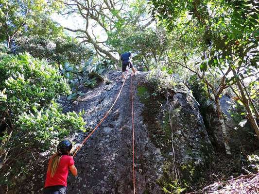 Na manhã seguinte logo cedo, pulamos da cama e partimos fazer um rapel no próprio Campos Místicos. Trilha rápida até o local e lá fomos nós!