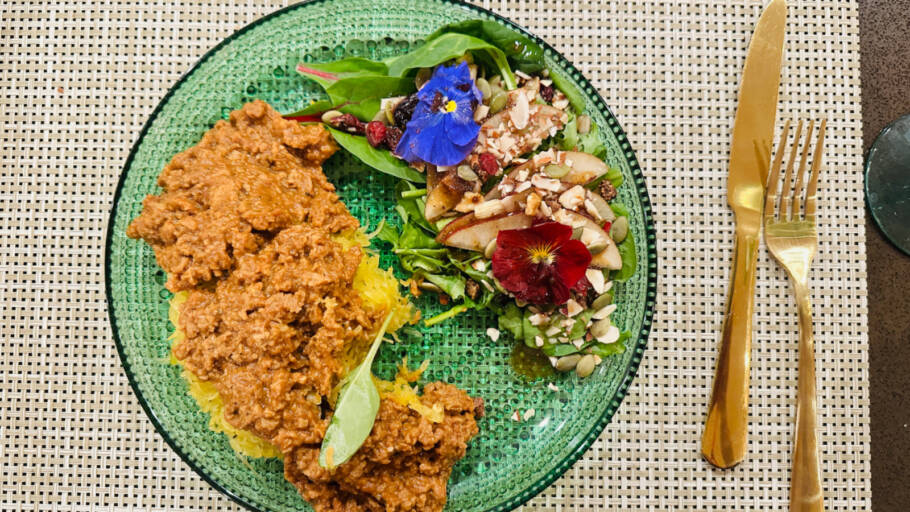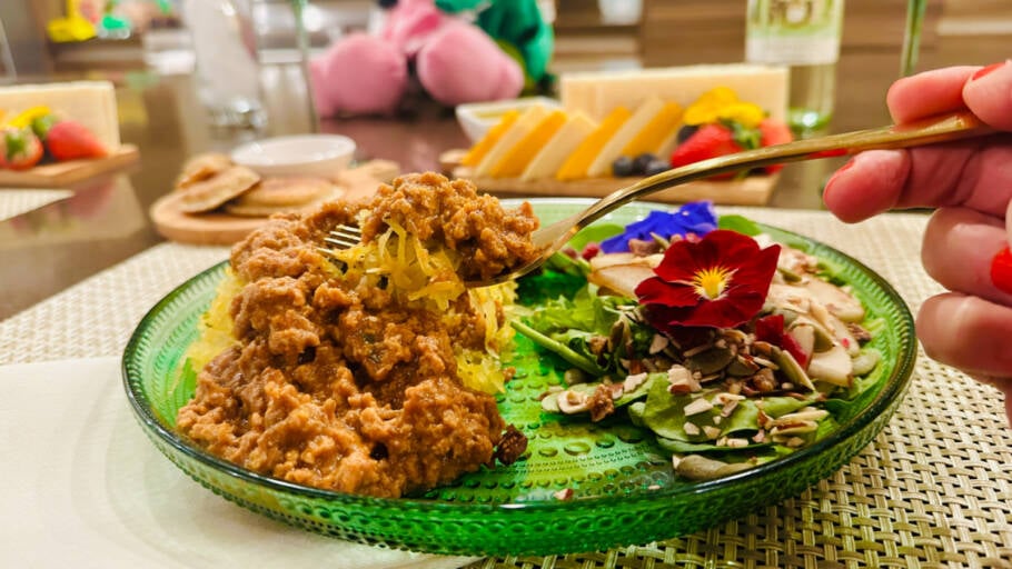 Camila preparou um spaguete squash à bolonhesa vegano, com carne de soja preferida da Xuxa. Delicioso. O banquete também incluiu uma entrada com seleção de queijos de castanhas e uma salada de folhas, pêras e amêndoas.