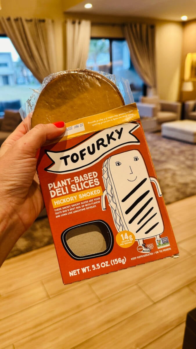 Lá, além de frutas e verduras frescas, achei queijos veganos que derretem no misto quente, que elaborei com um item surpreendente, Tofurky, um tofu preparado como peito de peru defumado. Acredite, o gosto é igual, e você consome proteína de primeira.