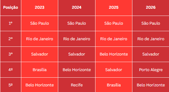 A Esfera, em um outro estudo, mapeou os resgates de passagens feitas em sua plataforma no período do Carnaval 2026 para entender o comportamento dos foliões. Nesse movimento, descobriu que Porto Alegre desponta como uma das cidades com maior volume de resgates, além dos Top 3 destinos tradicionais, que são: Rio de Janeiro, Salvador e São Paulo.