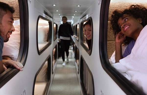 Batizado de Cabin, os veículos têm dois andares, 24 cabines com camas, lounge elegante, banheiro compartilhado e, claro, wi-fi.