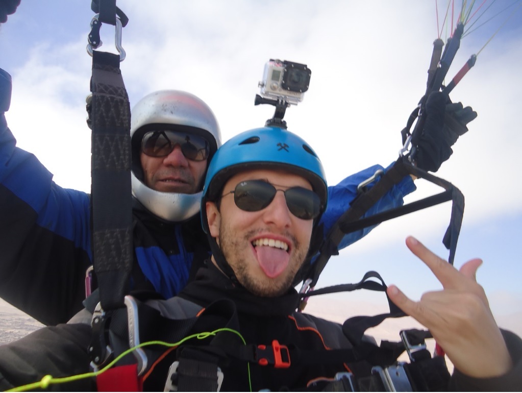 Após alguns minutos de voo, já sobrevoando o mar de Iquique, ao ter minha confirmação de que estava tudo bem, o instrutor começou a fazer algumas manobras. Ganhou e perdeu altura repentinamente e deu alguns giros, o suficiente para o friozinho na barriga voltar, mas ao mesmo tempo muito divertido.