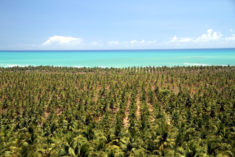 Dali, é possível avistar o encontro da Lagoa do Roteiro com o mar e a cenográfica sequência de coqueiros.