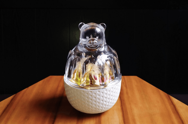 A obra de arte é servida em uma tigela de porcelana decorada com um motivo de favo de mel e uma tampa de cristal Baccarat na forma de um ursinho chamado “Zoo Bear”.