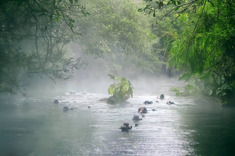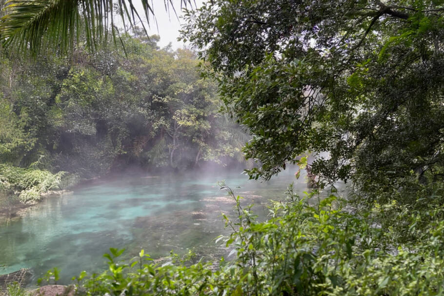 Nos dias mais frios, o rio da Nascente Azul chega a ficar coberto por uma névoa, um visual mágico criado graças à diferença entre a temperatura do meio externo (mais baixa) e a da água (mais alta).